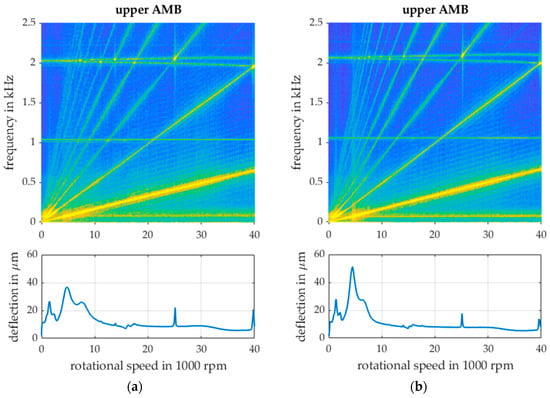 (a) Measured Campbell diagram and deflection of the rotor with a bias current of 5.67 A without specimen; (b) Measured Campbell diagram and deflection of the rotor with a reduced bias current of 4 A without specimen.