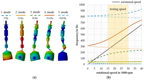 (a) Calculated bending eigenmodes below 1 kHz of the rotor with sample; (b) Calculated Campbell diagram of the rotor with the specimen. Each eigenmode shown in (a) splits in a forward and a backward mode.