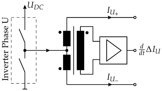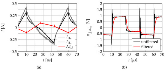 - INFORM method: Theoretically, the current ripple caused by a single voltage pulse contains the whole information of the rotor position. As asymmetries appear in the real system (caused by mechanical, electrical or magnetic deviations), it is beneficial to use the current slope information from independent voltage pulses. Furthermore, the voltage pulses must have a minimal pulse duration , which is given by the settling time of the current slope measurement path (Figure 3b). The duration is defined by the decay of the eddy currents and the settling of the analog filter, which causes a distortion of the differential current slope signal.