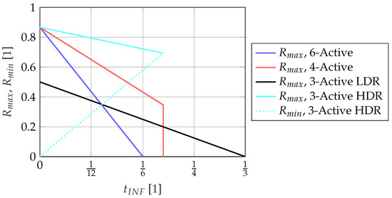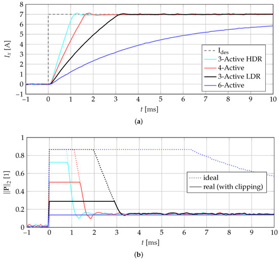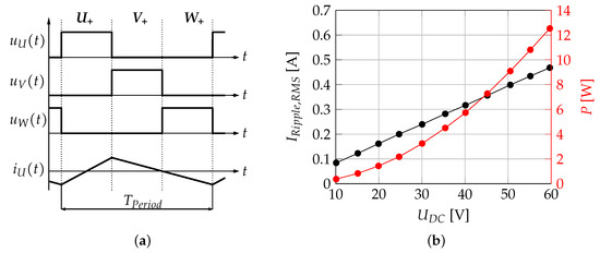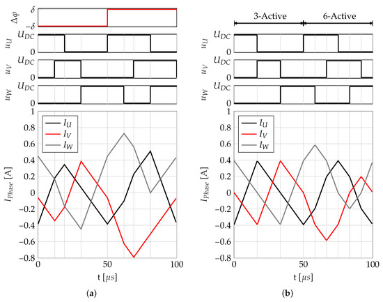 - Inverter: Short pulse lengths could cause problems in semiconductor switches. Hence, the specified recovery time of the switches must be considered in the PWM pattern [22]. Furthermore, a proper operation of a potential charge pump of the gate driver must be ensured. Therefore, the pulse pattern has to provide at least one switching action in each phase.