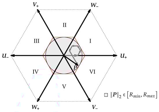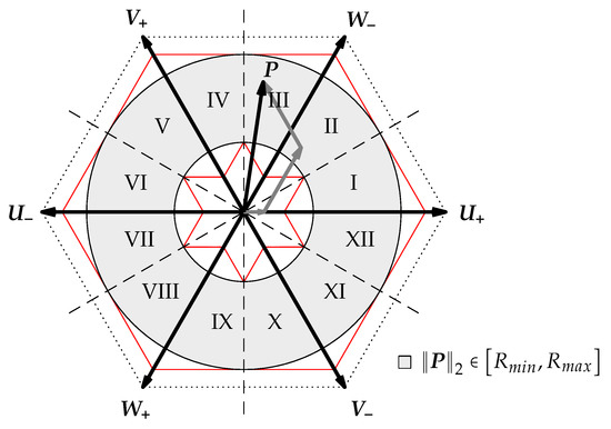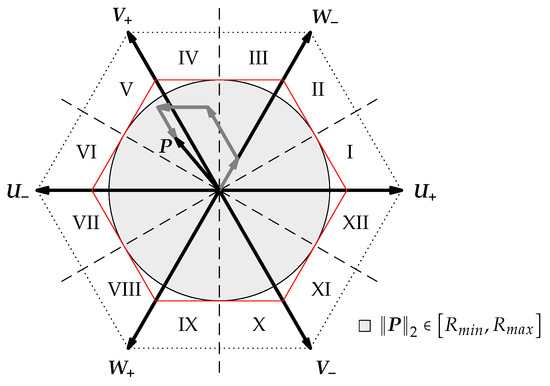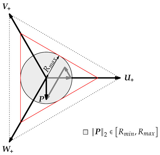- Modulation amplitude: The modulation amplitude defines the maximum length of a desired voltage space vector. High modulation amplitudes of the desired voltage space vector allow a high dynamic of the current control. For a symmetrical (angle independent) operation of the current controller, it is beneficial to limit the modulation amplitude to the in-circle of the possible modulation area. Theoretically, the symmetrical modulation amplitude can achieve a value of for the given AMB system.
