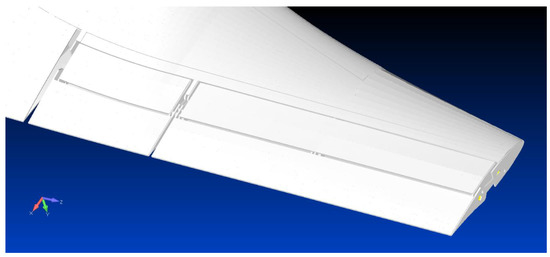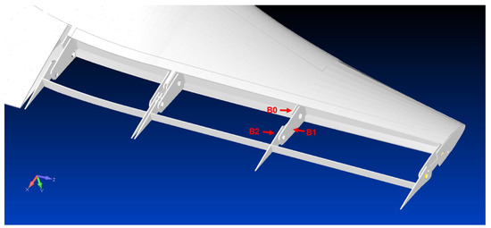 The upper- and lower-morphing mechanisms consist of three consecutive hinge-connected blocks (B0, B1, B2), whose relative rotations enable the trailing edge camber morphing (Figure 2). Each block is covered by segmented skins connected by a spar box. The B0 block is rigidly connected to the rear spar of the winglet structure. The inner actuator drives the B1 block to rotate around its hinge system and blocks the system while deployed. The actuation rods are particularly important (and critical) in this kind of architecture, bearing the majority of the incoming loads. The resulting system is a 1-degree-of-freedom architecture (SDOF) having a specific gear ratio depending upon the mechanical hinges and links positions. The upper region of the structural box of the winglet is also shown in Figure 3. The two actuators, driving the lower- and upper-morphing tabs, respectively, were initially modelled as lumped masses. The aluminum segmented skin was divided into separate plates, two for each block for both the lower and the upper tabs, attached to the respective edges of the machined ribs and along the associated spars.