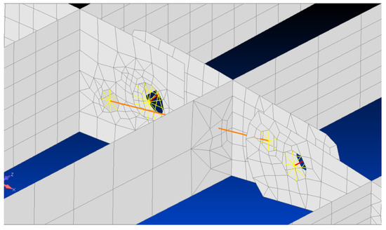 The simplest way to simulate wing morphing mechanisms at the preliminary stages of the design is to assume the mechanical components as fully rigid (Figure 4). This allows designers to develop the kinematics and validate linkage dimensions, hinges positions, and instant centers of rotations, for the initial structural sizing of the components. As a result, the hinges of the finger-like mechanisms were thus FE modelled by rigid connections by releasing the rotational degree of freedom activated by morphing. The sole purpose of these elements was to transfer the loads between the grid points in such a way that all the slave (dependent) nodes had zero relative deformation after the load application. In such a way, one cannot observe any oval effect of hole or any bearing loaded pattern on the holes.