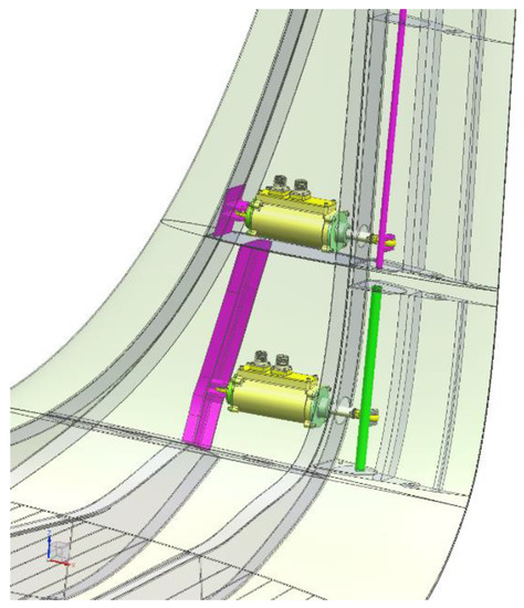 The kinematic chain proposed in this work was based on two separate actuators, one for each surface, positioned at different winglet height (see Figure 6). Such a solution minimized potential actuator assembly and integration issues by privileging accessibility and maintenance. The control units were installed within the nearly horizontal part of the winglet box with the aim to reduce the bending moment applied to the wings.