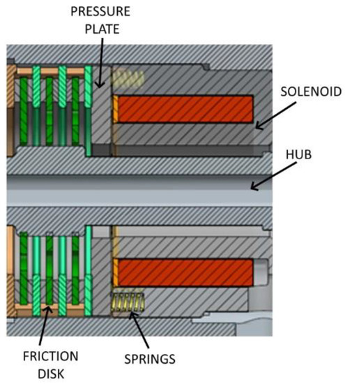 Figure 10 shows a schematic drawing of the brake. It consisted of four basic elements: a solenoid, an anchor (pressure plate), springs, and a friction disk. Operation was relatively simple. When the solenoid was not powered, the springs press the anchor against the friction disks, thus generating a braking torque. When it was required to disengage the brake, the powered solenoid generated a magnetic force that pulled the anchor towards itself, effectively detaching the anchor from the friction disks, thus allowing the actuator to move.
