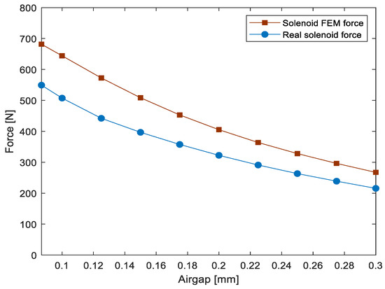 The results obtained in the design phase of the electromagnetic brake were compared to those obtained during a preliminary test carried out on a mock-up of similar sizing in order to characterize the brakes. Figure 11 shows a comparison between the electromagnetic strength of the solenoid obtained through a finite element analysis and the ones obtained experimentally powering the brake with 0.91 A. As is evident, these force values depended on the distance between the anchor and the solenoid (airgap). An electromagnetic finite element analysis was performed on a simplified 2D model in which SAE 4340, Hiperco50, and 15-5 PH material were considered for mechanical components, anchor (pressure plate), and friction disks, respectively.