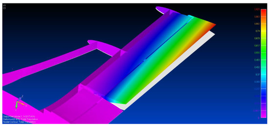In order to simulate the actuator stiffness (on the order of 5 kN/mm) and actuation chain into the morphing winglet model, an equivalent torsional spring was added to both the upper- and lower-morphing tabs, respectively. In such a more realistic condition, the natural frequency of the mechanical system, referred to as morphing mode of the device in operative conditions, increased up to 14 Hz, being totally dependent on the actuation kinematics. Figure 13 shows the morphing mode reached by the upper tab while considering the actuation system stiffness. In this case, the actuator constrained the lower-morphing rib through its nominal stiffness, and hence, the entire tab through the structural box. It is worth noting that due to the morphing tab elasticity, the upper region of the tab deflected more than the lower one since the actuator was mechanically attached to the lower region of the upper tab. This impacted the actual morphing aeroshape and deserves special attention in the aerodynamic design to properly estimate the performance degradation due to the structural elasticity. Alternatively, this effect may be compensated through an adequate structural compliance distribution. Due to the higher span-wise stiffness of the lower morphing tab as a consequence of its reduced dimensions, the structural response, not addressed in this work, was much more uniform.