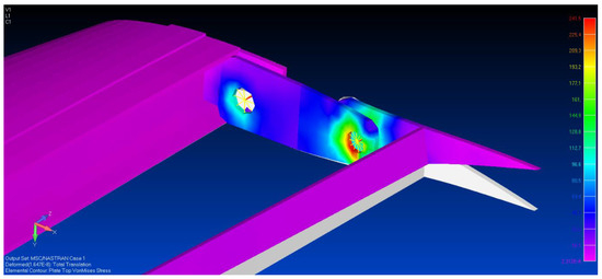 The final step of the preliminary assessment of the electromechanical actuator integration into the morphing structure consisted in evaluating the static response of the morphing tabs under operative loads. The morphing ribs and spar were made of an aluminum alloy, whereas the static aerodynamic loads were deduced from the literature [26]. Such aerodynamic forces, resulting in a hinge moment on the order of 101.7 Nm, were simulated by applying aerodynamic pressure to the tabs upper skin. These simulations predicted a maximal stress of about 240 MPa, which was lower than the yield strength (500 MPa for Al 7075-T6). An example of stress distribution over the finger-like mechanism is shown in Figure 14. The global added bending stiffness due to the partitioned skin was assumed negligible with respect to the global structure, even if it contributed to reduce the relative displacements between the ribs under the action of the aerodynamic pressure.