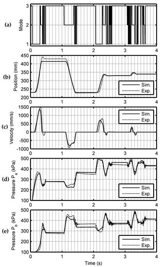 Comparison of simulation and experimental results plotted vs. time. (a) Commanded valve operating mode; (b) Positions; (c) Velocities; (d) Chamber A pressures; and (e) Chamber B pressures.