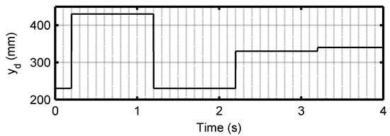 To make the comparison of the SMC3, DVMPC1, and DVMPC2 controllers fair their parameters will be tuned using optimization. A multi-step desired position trajectory is used so their performance will be evaluated under dynamic and steady-state conditions. Figure 3 shows the desired trajectory. The step heights are 200 mm, –200 mm, 100 mm and 10 mm. The total duration is 4 s.