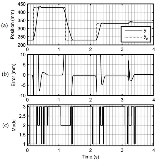 Experimental result for 3-mode sliding-mode control algorithm (SMC3) with the nominal total mass. (a) Desired position, , and sensed position, ; (b) Position error, ; and (c) Commanded valve operating mode, .