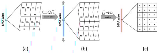 SMA wires used as actuators can “remember” its original shape after deforming when heated up. This characteristic is based on two different phases at the crystal lattice level, a low-temperature phase called martensite, and a high-temperature phase called austenite. The transformation can be initiated by mechanical stress or temperature. The temperature-induced transformation forms the basis for actuators with SMA [7]. This is possible because the microscopic changes in the crystal lattice have a macroscopic influence [8], the austenitic phase has a cubic space-centered crystal structure, while the martensitic phase has a monoclinic crystal structure [9,10]. The martensitic phase is characterized by the fact that it can occur in different orientations. In a two-dimensional view, it can be distinguished into M+ and M− (Figure 1a). A quasi plastic deformation in the martensitic phase can be imagined as a flipping of the individual orientations [9]. As a macroscopic consequence, SMA wires elongate by applying an external tensile force, since the M− oriented martensite crystals flip in M+ orientation at the microscopic level, whereby only the M+ orientation exists (Figure 1b). If the wires are heated, they shorten due to the transformation into austenite (Figure 1c).