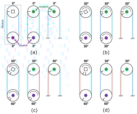 Figure 2 shows the functional principle using an exemplary 90° rotation, where each wire-wheel pair (module) generated 30°. The blue or purple dots in the wheels indicate mechanically coupled wheels. The color of the wires indicates whether a wire was activated (red) or not (blue). Figure 2a shows the starting position at 0°. Figure 2b shows the activation of the first wire, which caused the wheel in the upper right corner to rotate by 30°. Due to the mechanical coupling, the other wheels would be forced to rotate by 30° as well. Afterward, the second wire was activated (Figure 2c), while the first wire remained activated. This resulted in another 30° rotation for the coupled wheels on the bottom shaft causing the output wheel to rotate by a total of 60° now. Finally, the third wire was activated (Figure 2d), while the previous wires were still activated. This caused the output shaft to rotate by another 30°, which resulted in a total rotatory angle of 90°. The output wheel was mechanically coupled with the output shaft, while the remaining wheels could rotate without rotating the shafts. Therefore, only the output wheel could transmit a moment to the shaft. The first wheel on the lower shaft was fixed to serving as a locating bearing. Figure 3 illustrates these interconnections. To save space, the modules were stacked on top of each other. Resetting the actuator to the initial position worked with the same principle.