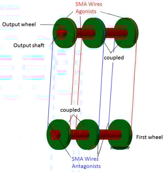 Actuators with shape memory alloys (SMAs) are mostly used to perform a linear motion [1,2], but SMA wires can also be used to realize a rotary motion [3,4]. The industry mainly uses combustion engines, pneumatic or hydraulic machines, and conventional electric motors. Combustion engines require a tank, including fuel, and produce noise as well as exhaust fumes. Hydraulic or pneumatic actuators are expensive to purchase and maintain and are always a part of a larger circuit. They require tubes, valves, pumps, or compressors. Conventional electric motors require either coil, needing additional power, or rare-earth to generate high magnetic fields.