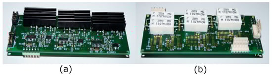 Below, the development of the control board is explained. This board contained a pole pin header for the different supply voltages, 5 V for the supply of the microcontrollers, on the one hand, and 12 V for the supply of the remaining hardware and the SMA wires, on the other hand. Besides, the board consisted of three microcontrollers connected to the IIC bus, which controlled the individual wires via voltage-controlled current sources. A total of six of these power sources were installed. Thus, one microcontroller and two power sources were installed per module. If the number of modules was changed, only this had to be adapted accordingly, while no changes were necessary on the communication board. Signal conditioning was implemented on the board to be able to, for example, adapt the voltage drop of each SMA to the input voltage range of the analog-to-digital converter (ADC), integrated into the microcontroller. The top and bottom of the control board are shown in Figure 7.