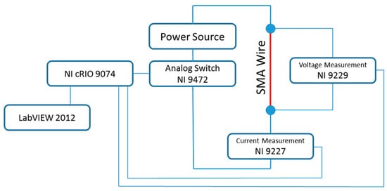 The measurement and control setup, illustrated in Figure 8, was based on components from National Instruments and uses LabVIEW to control the experiments and record the data. The analog switch NI 9472 applied the voltage from the power supply to the wires. The voltage drop across the wire was measured by a NI 9229 voltage measuring module mounted parallel to the wire. The current flowing through the wire was measured by a NI 9227 current measuring module mounted in series with the wire. The measurement results were transmitted to the PC via a NI cRIO 9074 control unit.