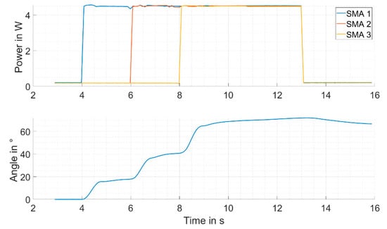 The SMA wires were heated by using constant electrical power. Figure 10 shows the first measurements of the electrical power over time as system input and the rotation angle of the actuator over time as system output. Every 2 s another agonist wire was activated with a power of 4.5 Watt. The individual steps in the plot showing the rotation angle over time were a result of the individual activations of the wires. Each step showed an angle change of about 20°. These intermediate positions resulted from the design of the actuator and could, therefore, be achieved without additional control. After reaching the maximum angle after 13 s, the input power was switched off. As a result of this, the wires cooled down, leading to an angle deviation caused by the elastic deformation of the antagonistic wires, which later relaxed again.