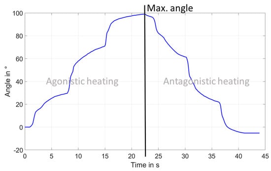 This prototype did not reach the desired maximum rotation angle of 90°. After optimization of the wire installation process and some smaller design improvements, the result of the rotational movement is shown in Figure 11. Each step in both directions was about 30°. The maximum rotational movement was about 100°. Reaching the maximum rotation angle at about 22 s, the electrical power applied to the SMA wires was switched off, and the opposing wires were now being heated. This resulted in a corresponding movement in the opposite direction. Since the position at 0° was a resting position while no external or internal forces were applied to the system, heating the antagonistic wires resulted in a negative angle.