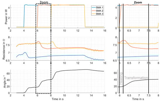 Due to its design, SMA1 was shorter than the other SMA wires, resulting in a lower basic resistance. If an SMA wire was being heated, the resistance first increased due to the positive temperature coefficient of metals, as shown in the zoom plot of Figure 12 from 6–6.2 s. The following decrease of the SMA resistance between 6.2 s and 7.5 s was a consequence of the phase transformation from martensite to austenite, accompanied by a starting rotational motion. After 7.5 s, the resistance increased again because of the end of the phase transformation combined with ongoing heating of the SMA wire. As a result, the rotation angle remained constant. This large resistance change could be used to determine the position of the actuator because of a correlation between the decreasing resistance signal and the rotational angle (see Figure 12, Zoom). This correlation enabled detecting the mechanically given intermediate positions at 30°, 60°, and 90° by identifying local minima in the resistance signal, as well as reaching and controlling any desired position using a model-based control. The basic principle of antagonistic SMA wire systems and their controlling abilities are shown in [14].