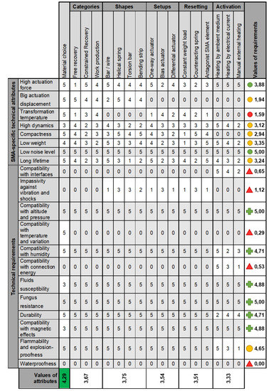 Then every requirement is rated on a scale from 1 to 5, whether the attribute and the working principle have a big positive influence on fulfilling the requirement (rated with “5”) or nearly no positive effect (rated with “1”). The rating bases on literature research and empirical values of experienced users of SMA technology. In the following, the specific scored correlations for the SMA-specific requirements will be explained briefly.