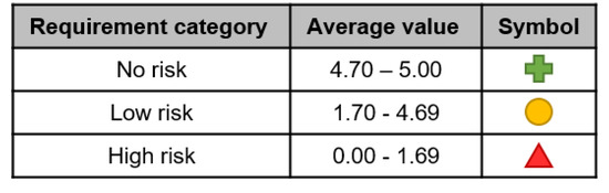 In a last step, the arithmetical average of all ratings for every requirement and for every attribute is calculated. The average values of the requirements are underlined by a traffic light system. Requirements without a risk to be not-fulfilled by SMA based systems are marked with a green symbol (values larger than 4.70). Requirements rated with a low risk (values between 1.70 and 4.69) are assigned a yellow symbol and high-risk requirements (values up to 1.69) a red symbol (see Figure 3). Thereby it is easy to recognize which requirements are critical and non-critical for SMA-based systems. The critical requirements are further discussed in Section 5.2.