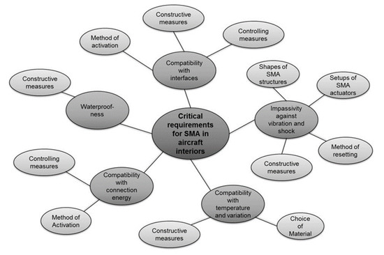 This paper evaluates possible applications for SMAs (Shape Memory Alloys) based on the requirements in the field of aircraft interiors. The authors gather requirements regarding industry standards and regulations by detailed literature research and lead user interviews. They develop a classification scheme for SMA-based actuators, which consists of SMA-specific technical attributes and requirements. This classification scheme allows one to evaluate the feasibility of using SMA-based systems in aircraft interiors. Furthermore, this paper clusters critical requirements and discusses solutions for limitations of SMAs in aircraft interiors. The authors identify critical and noncritical requirements for the implementation of SMA-based actuators. They suggest solutions for critical requirements in order to improve the possible range of applications for SMAs. The study exclusively regards the field of aircraft interiors and the currently existing industry standards and only indirectly takes laws into account. The evaluated requirements and proposed solutions can be transferred to other areas such as the automotive industry. This structured analysis of the feasibility of SMA-based systems in aircraft interiors is an innovative research work and, therefore, is valuable in order to benefit from the advantageous properties of SMAs.