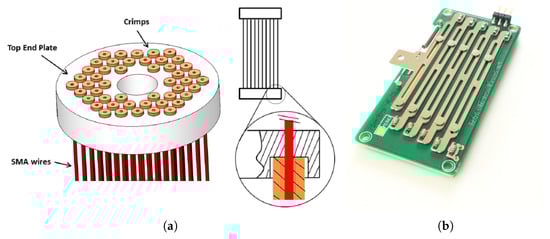 - in [13], 48 SMA wires of 0.15 mm diameter was arranged in parallel configuration between two virgin Teflon end plates (Figure 1a). This configuration can lift more than 100 lbs (approximately 444.8 N). During the experiment, some interesting non-linear characteristics, such as dry friction, saturation, and unpredictability of response for the same input, were detected. Also, the proposed configuration does not offer a flexibility advantage to the actuator.