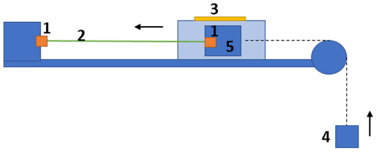To test different configurations of the actuators, a test bench was built. The test bench allows multiple configurations for testing the SMA actuators: the SMA wire with a hanging mass attached to the non-fixed end, and the SMA wire with a bias spring attached to the non-fixed end, tests various wires in parallel configurations, adding external cooling system such air-flow and an agonistic–antagonistic actuation with two SMA actuators. A schematic diagram of the test bench part used in this work can be seen in the Figure 3, where the SMA actuator in the lineal movement can be tested. In Figure 3, 1 represents the points where the SMA actuators are attached, 2 represents the SMA actuator, 3 is the position sensor which measures the displacement of the movable part, 4 is a weight which will be moved by the actuator, and 5 is the movable part.