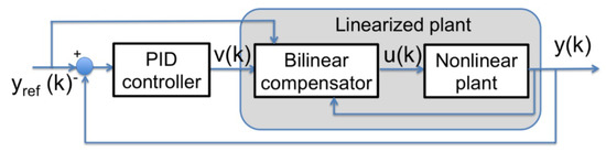 The main difficulty when controlling SMA-based materials is their saturated hysteretic behavior, which appears during martensite–austenite and austenite–martensite transformations. This introduces in the system non-linear behaviors, which makes it difficult to develop control algorithms for this type of actuator. In [20], a four-term Bilinear PID (BPID) control strategy was successfully applied to control a single SMA wire. Based on this work, a BPID controller with a bilinear compensator is proposed to control SMA actuators. The BPID controller is a combination of a standard linear PID controller cascaded with a bilinear compensator. The control scheme is shown in Figure 4. The architecture relies on the structure proposed by Martineau et al. [21]. The non-linearities of the plant limit the performance of the control loop and, applying this type of control architecture, an important advantage was obtained.