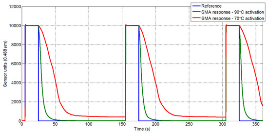 As can be seen, in the cooling stage (“recuperation”) the low-temperature wire is much slower than the high-temperature wire. The thermal transfer between the wires and the ambient environment, from 90 C to ambient temperature and from 70 C to ambient temperature, affects the behavior of the actuators. In the first case, the temperature exchange is more accelerated due to the elevated temperature difference. This leads to a fast actuator “recuperation” and thus achieves set point. The low-temperature wire slows the actuator movement with approximately 20 s of delay compared with the actuator based on the high-temperature wire. Moreover, the low-temperature wire is not capable of recuperating the entire initial shape, resulting in an error presented in the permanent regime.
