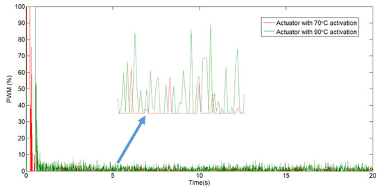 To calculate the exact power consumption, a current sensor can be placed in series with the actuator. The PWM signal is only trying to estimate the power consumption (the PWM signal is proportional to the current), but this estimation is not reliable due to the signal fluctuating. The PWM signals of the two actuators are compared in the Figure 6. The PWM signal area of the low-temperature wire is less than the area of the high-temperature wire, which implicate a lower energy consumption. This is largely due to the necessary temperature activation (lower) obtained with the Joule effect.