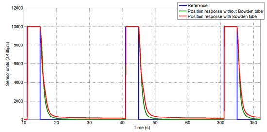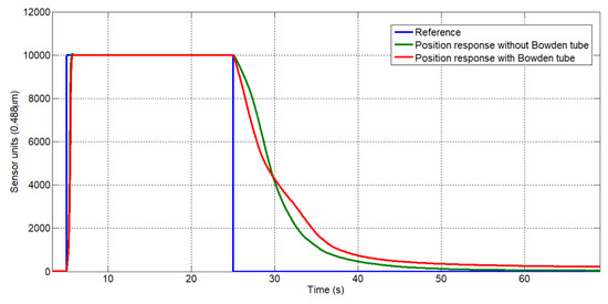 The simple actuator is based on SMA wire from the Dynalloy Inc. Company, which is introduced in the PTFE tube and everything in a Bowden cable. The diameter wire used in this experiment was 0.51 mm. In Figure 7 the response of the SMA actuator with the Bowden cable and the response of the actuator without the Bowden cable is presented, when the reference pattern is represented by a step reference with the amplitude of 10,000 units of sensor. With the same BPID controller parameters, the actuator responses are similar.