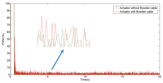 The corresponding control signals, PWM currents, are given in Figure 11b. Although the peaks at the beginning are similar for both configurations (and the energy consumption, which is proportional to the PWM signal), the option with a single Bowden cable has a lower energy consumption during the displacement stage.
