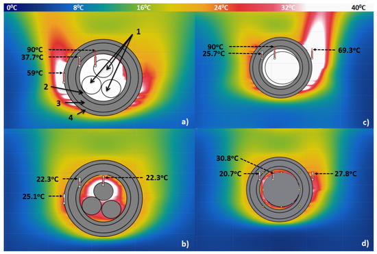 Simulation of thermal convection of two SMA-based actuators configuration [25] where: 1—SMA wires, 2—PTFE tube, 3—Metal part of the Bowden cable, 4—Nylon part of the Bowden cable (a) heating stage of three SMA wires actuator during 20 s, (b) cooling stage for 10 s after 20 s of heating stage, (c) heating stage of one SMA wire actuator during 20 s, (d) cooling stage for 10 s after 20 s of heating stage.