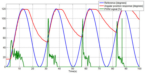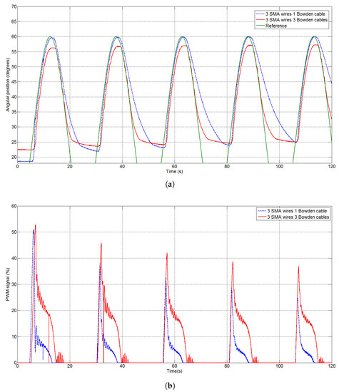 The same test with the two configurations was realized with real actuators. The results can been seen in Figure 11 where (a) presents the results of the two configurations (three SMA wires in three different Bowden cables and three SMA wires in only one Bowden cable, and (b) presents the PWM signals of the actuators. The two configurations were tested in a test bench capable of simulating the elbow joint of the human body for a person of 70 kg. The initial position of the elbow joint is 20 degrees, and the reference follows a sinusoidal pattern with a 30-degree amplitude and a 30-degree bias.