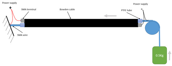 The double actuator is composed of two or more SMA wires (always an even number), each one on an individual PTFE tube and everything in one Bowden cable (Figure 12). One of the SMAs wires relates to one end to a fixed part and another end with a terminal which is fixed to the Bowden cable (SMA terminal). Another SMA relates to one end to the mobile weight, over which is actuated, and the other end is fixed to the other Bowden cable end. Both the SMA wires are connected to the power supply such as in Figure 12. Over the Joule effect, the SMAs wires contract and in the same time move the entry structure with the Bowden cable to the fixed part.