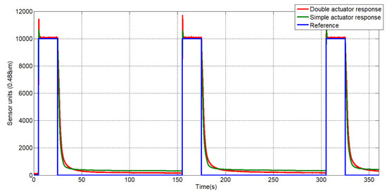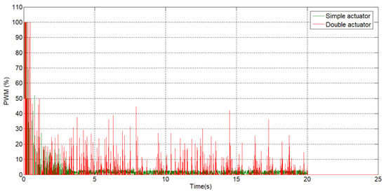 The PWM control signals of both actuators is presented in Figure 14. As can be seen, the PWM controller signal generated by the double actuator presents a relatively high peak compared with the PWM signals of the simple actuator. These high peaks can be cancelled by recalibrating the BPID controller.