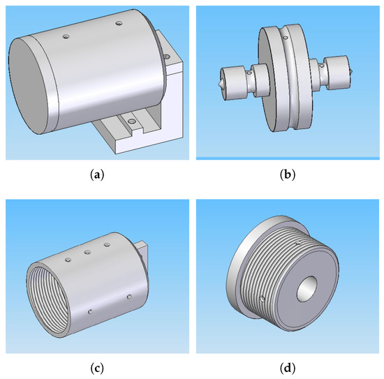 Gearbox 1:4 structure components. (a) Gear 1:4; (b) Gear unit pulleys; (c) Gear housing; (d) Gear cover.