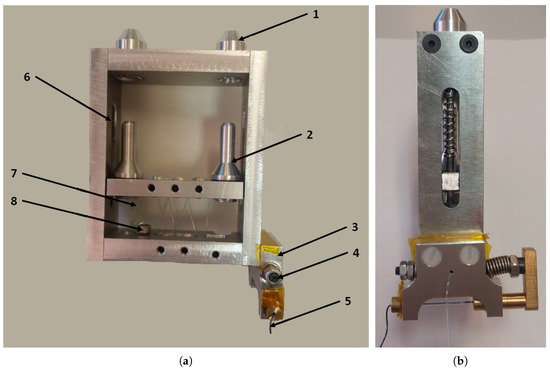 The method to fix the SMA wire or SMA-based flexible actuator (with the Bowden cable) is as follows: one of the ends of the SMA wire is fixed to the structure of the test bench and the other SMA ends is crimped to a movable part of the test bench. Over this movable part a magnetic strip on its top is fixed such as a part of the position sensor. When the wire contracts, the movable part is displaced, and the position sensor measures the displacement of the magnetic strip. In the movable part, a high-resistance polyethylene wire, Dyneema, from the Caperlan company was fixed, from where the dead weight or spring will be attached.