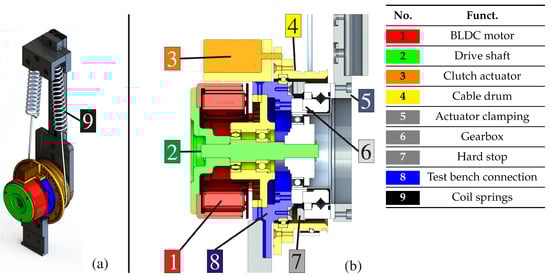 The actuator designed is shown in Figure 2. All important components are numbered consecutively and will be described in the following section. The core task of the actuator is to convert electrical energy into mechanical energy. To fulfill this task, an EC90 Flat Frameless with a 260 W (1) (Maxon Motor AG, Sachseln, Switzerland) motor was chosen. The motor torque is transmitted via the drive shaft (2) to the wave generator (input) of the Harmonic Drive gearbox. The motor can provide a torque of about 1 Nm in rated operation. The gearbox and the engine are connected via the joint connection part (8), and the test bench mount is also mounted here. The load connection (5) for the test bench is connected directly to the output of the gear unit (6). The gearbox is a Harmonic Drive HFUS-2SO with a reduction ratio of 50:1 (6) (Harmonic Drive AG, Limburg an der Lahn, Germany). The load-side crossed roller bearing can subsequently be employed directly as a joint bearing for an exoskeleton (static load rating of 22 kN, maximum axial load of 5150 N, maximum tilting torque of 515 Nm) [27]. An adjustable end position limitation (7) is integrated into the actuator. This allows a swivel range of 120 in the version for the exoskeleton. The swivel range can also be changed by replacing the end position discs. Conventional coil springs (9) with a spring rate ranging from 1.8 N/mm–11.9 N/mm were used to realize the PE. The springs are connected to the cable drum (4) with a wire cable. The springs are extended to half of their maximum length in a neutral position, as this provides the largest swivel range. The lifting armature of the bistable magnet (3) fixes the ratchet disc and the cable drum (4) in a certain position to define the zero position of the springs. A short current pulse is required to fix the springs, and no additional current is needed to maintain the fixation due to the bistable magnet.