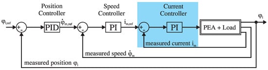 A cascaded control structure, as shown in Figure 6, was applied to control the actuator. The innermost control loop was the current controller of the brushless DC motor. The electrical parameters of the motor are decisive for the design of the controller. This Proportional-Integral (PI) current controller was implemented on the ESCON 50/8 motor control unit of the EC90 Frameless (Maxon Motor AG, Sachseln, Switzerland) and ran at a sampling rate of 53.6 kHz. The speed controller was implemented on a real-time computer (MicroLabBox (MLB), dSPACE GmbH, Paderborn, Germany) system. In contrast to the PI current controller, the connected load also determines the design of the PI speed controller. The position controller was also implemented on the MLB. The system sampling rate on the MLB was set to 10 kHz. The model shown in Figure 4 was applied for speed and position control.