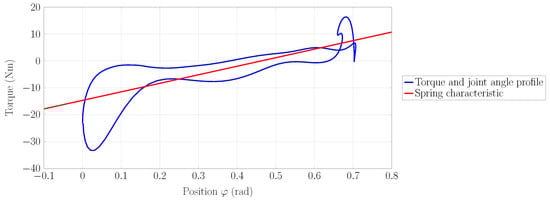 An averaged angle and torque trajectory from Visual3D measurement data was used to determine the spring and the preload angle optimally. The method of calculation was based on the procedure described by Wang et al. [11]. The torque and joint angle profile is shown in Figure 8. The joint torque of the hip in the sagittal plane is plotted over the angular position of the hip joint. To calculate the optimum spring for a complete gait cycle, the stiffness was obtained by linear regression [31]. The spring characteristic curve is defined by: