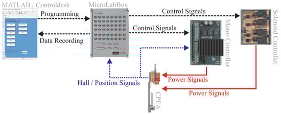The test bench was set up according to the topology shown in Figure 9 to perform the experiments. The spring was deactivated or activated by the switching agent in the experiments; a self-made relay board was built for its control. Current and speed controllers were integrated into the motor controller. The MLB was selected to implement the superimposed position control and the ILC. The values measured were recorded via the connection between the computer and the MLB.