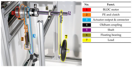 The mechanical structure of the test bench during the experiments is shown in Figure 10. The actuator CPEA (motor (1) and the PE with clutch (2)) were attached to an aluminum profile frame. Actuator output (3) and shaft (5) were connected by an Oldham coupling (4). The CPEA cross-roller bearing was supplemented by a floating bearing (6) (bearing block PBT25, Misumi, Koto, Tokyo, Japan) close to the load. During the tests, the actuator was equipped with a load pendulum (7) with a lever arm of 0.4 m and a mass of 5 kg, and the mass moment of inertia was Jmkg, an approximation of the leg in the swing phase, when the thigh and the lower leg were considered as point masses [25].
