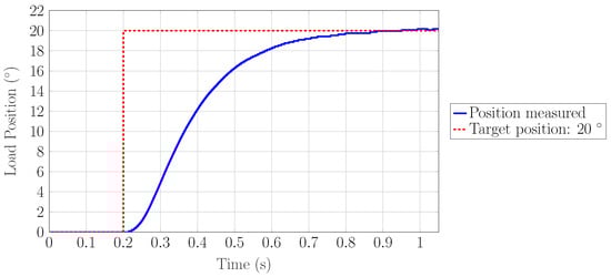 The results of the step response and the controlled operation with a hip trajectory for 1.1 m/s follow. The ILC was only applied to the gait trajectories. For the step response, the cascaded control was applied as it was not a cyclic task. First, the step response is shown in Figure 12.