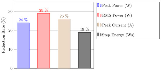 The motor power during the tests is shown in Figure 14. When dimensioning the motor, the maximum power consumption was another selection criterion. The maximum power consumption was reduced from 94.7 to 71.1 W (24%) for the hip reference trajectory. The average RMS power and the energy consumption per step were important for the dimensioning of the entire system with battery or power supply. The RMS power was reduced from 26.9 to 19.1 W (29%) by using PE. The quantity of energy per step was reduced from 18.4 to 14.9 Ws (19%). The PE in the motion tests with the hip trajectory on the test bench reduced all characteristic specification values significantly. To summarize, the relative improvements of the characteristic specification values are shown in Figure 15.