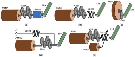 In order to facilitate compliance in a robot, it must include a compliant actuator. Five of the most commonly used electromagnetic actuator designs for compliant actuation of robots [] are illustrated in Figure 1.