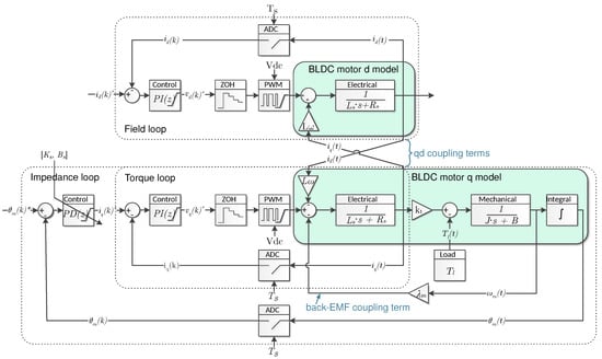 A cascaded controller architecture is used to enable active impedance control. All three loops (field, torque and impedance) are presented in the block diagram (Figure 3).
