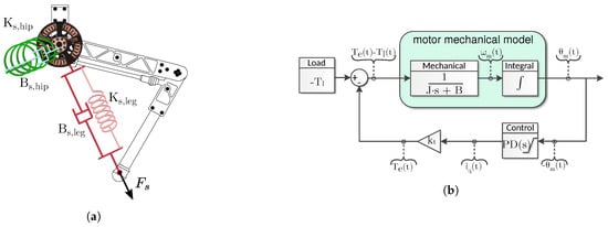 The active impedance controller is used to compliantly control the angle of the rotor or the trajectory of the end-effector of a robot. As no specific application is focused on in this paper, a simple design methodology is proposed (based on the standard and well-known pole-placement method) that only involves controlling the compliance at the rotor shaft. For example, in a legged robot this could correspond with the hip compliance shown in Figure 4a.
