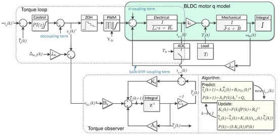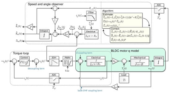 The observer calculates the reference voltage that is applied across the internal line resistance and inductance by subtracting the back-EMF coupling term (shown in Figure 3) from the quadrature voltage reference . This is used to estimate the quadrature current ahead by using the first order discretized state-space model of the voltage/current relationship in the internal RL circuit of the motor: